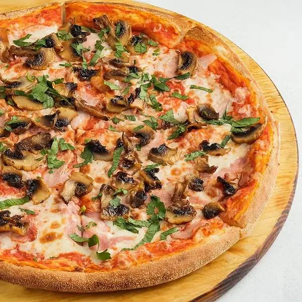 Тонкое тесто, соус томатный, окорок свинной, шампиньоны, петрушка, моцарелла